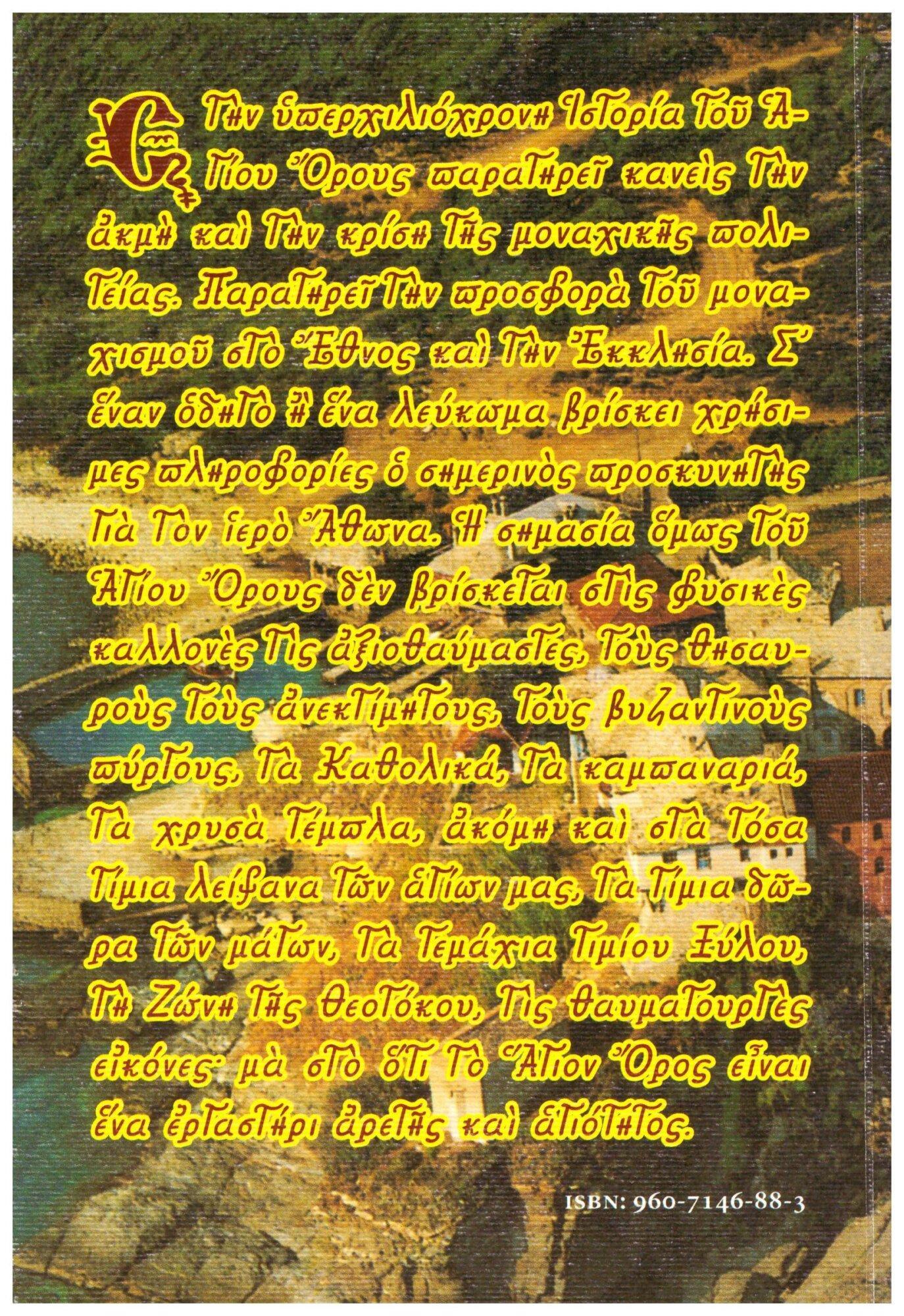 Με αναφορές ιστορικών γεγονότων, γεωγραφικών πληροφοριών και με λυρικούς τόνους περί του φυσικού κάλλους του αθωνικού τοπίου, με την ανάδειξη των εκκλησιαστικών τεχνών και τον πλούτο πολύμορφων καλλιτεχνικών δημιουργημάτων, που με τη χάρη του Θεού οι Αγιορείτες μοναχοί φιλοτέχνησαν στο διάβα των αιώνων, το βιβλίο αυτό δίδει το πλαίσιο όπου ανθεί η λατρευτική ζωή του Ορθοδόξου ανατολικού μοναχισμού στην πλέον αυθεντική, ανόθευτη και έγκυρη βίωσή του μέσω “ανειρήνευτων” ασκητικών αγώνων και ακατάπαυστων πνευματικών αθλημάτων.