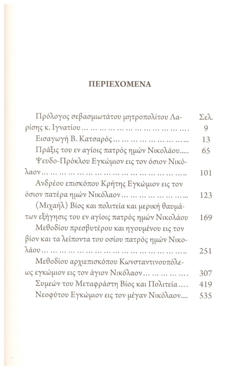 Θεωρώ εξαιρετική τιμή να προλογίζω αυτή την επιστημονική εργασία του πολυαγαπητού μου Χαραλάμπους Βας. Στεργιούλη, Διδάκτορος της Βυζαντινής Φιλολογίας, που αναφέρεται στο θείο πρόσωπο του εν Αγίοις Πατρός ημών Νικολάου, Αρχιεπισκόπου Μύρων της Λυκίας του Θαυματουργού, του πλέον λαοφιλούς αγίου στην Ορθόδοξο Πίστι μας. Ο Άγιος Νικόλαος δεν εορτάζει μόνο την 6η Δεκεμβρίου ή την 20ήν Μαΐου, αλλά και κάθε Πέμπτη, αφού στην “Παρακλητική”, στο ιερό αυτό λειτουργικό βιβλίο της Αγίας μας Εκκλησίας, βρίσκουμε και ψάλλουμε έως σήμερα ύμνους προς τον Άγιο Νικόλαο. […] (Από την έκδοση)