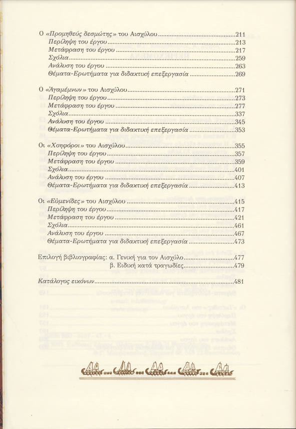 Η δραματική ποίηση της ελληνικής αρχαιότητας είναι η Τρίτη χρονολογικά ποιητική δημιουργία μετά την επική και τη λυρική ποίηση. Είναι μια από τις κορυφαίες λειτουργίες στο χώρο της αρχαίας ελληνικής γραμματείας. ( . . .) Στον τόμο περιέχονται εισαγωγικά στη δραματική ποίηση και στον Αισχύλο, ευρεία περίληψη κάθε δράματος, μετάφραση, σχόλια, ανάλυση και διδακτική επεξεργασία.