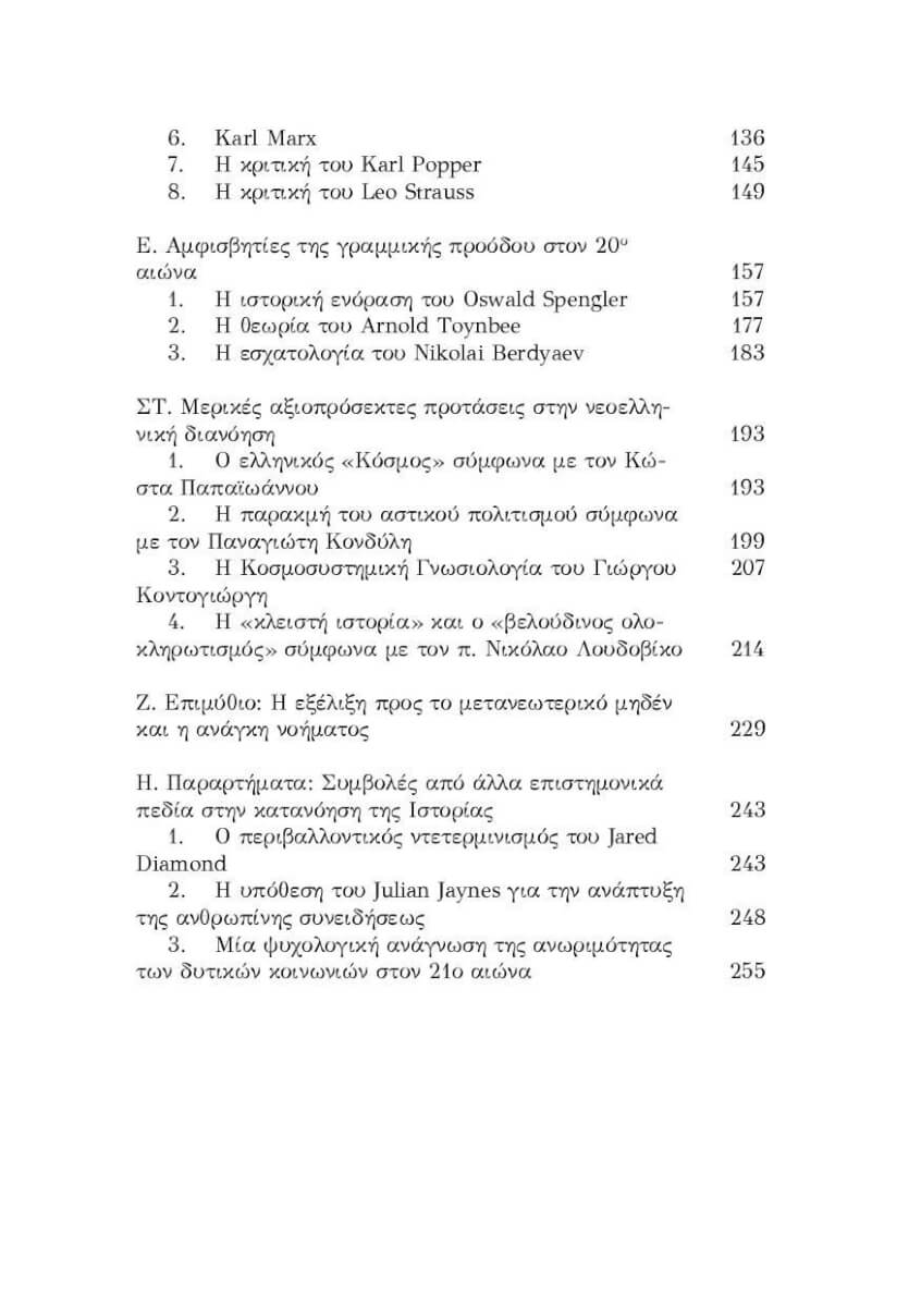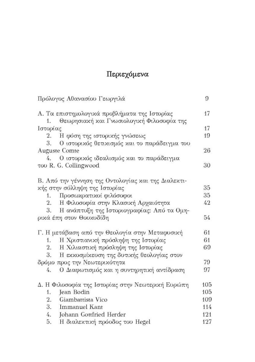 Ο ρομαντικός Hermann Hesse υποστήριζε ότι η μελέτη της Ιστορίας σημαίνει υποταγή στο χάος, με ταυτόχρονη διατήρηση της πίστεως στο νόημα και την τάξη. Πράγματι, η ιδεαλιστική παράδοση της γενέτειράς του, που θεμελίωσε γνωσιολογικά τον όρο “Φιλοσοφία της Ιστορίας”, κατέβαλλε κοπιώδεις προσπάθειες για να εντοπίσει -ή απλώς να προβάλει- λογικά σχήματα, αρχές και νόμους στην ατελεύτητη ροή των διηγημένων σε εμάς, “ιστορικών” γεγονότων. Στην πραγματικότητα, η θέαση της Ιστορίας ως προοδευτικής εκδιπλώσεως ενός καθορισμένου σχεδίου απετέλεσε σύλληψη του ευρύτερου Δυτικού Πολιτισμού και εξακολουθεί να απαντάται σε ποικίλες μορφές στις διάφορες εκδηλώσεις του. Το ανά χείρας πόνημα εξετάζει τις ρίζες, την ιστορική διαδρομή και εμμέσως τις προοπτικές αυτής της συλλήψεως.