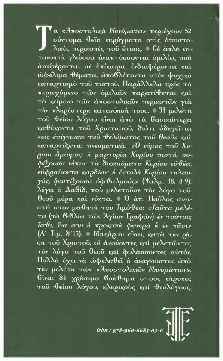 Τα “Αποστολικά μηνύματα” περιέχουν 52 σύντομα θεία κηρύγματα στις αποστολικές περικοπές του έτους. Σε απλή κατανοητή γλώσσα αναπτύσσονται ομιλίες που αναφέρονται σε επίκαιρα, ενδιαφέροντα και ωφέλιμα θέματα, αποβλέποντα στον ψυχικό καταρτισμό του πιστού. Παράλληλα προς το περιεχόμενο των ομιλιών παρατίθεται και το κείμενο των αποστολικών περικοπών για την πληρέστερη κατανόησή τους.