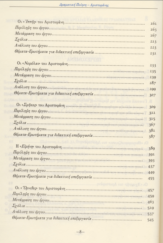 Ο τόμος, συνθετική εργασία του φιλολόγου Θεοδώρου Γ. Μαυροπούλου, περιέχει γενική εισαγωγή στη δραματική ποίηση και στα έργα των δύο κωμωδιογράφων, ευρεία περίληψη για κάθε έργο, μετάφραση, σχόλια, ανάλυση και θέματα – ερωτήματα για περαιτέρω επεξεργασία. (Από την παρουσίαση στο οπισθόφυλλο του βιβλίου)