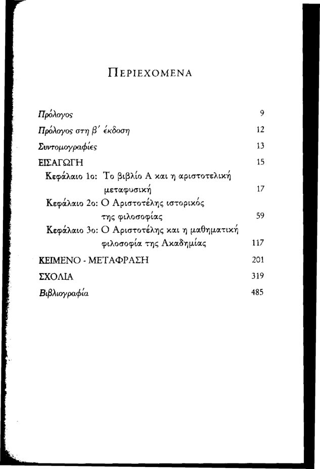 Εδώ και αρκετό καιρό το βιβλίο βρισκόταν εκτός κυκλοφορίας, καθώς η πρώτη του έκδοση εξαντλήθηκε σχετικά γρήγορα. Αισθάνθηκα την έλλειψή του κυρίως στη διδακτική πράξη, καθώς το Α των Μετά τα φυσικά αποδείχθηκε ότι προσφέρει ιδανική πρόσβαση στη φιλοσοφία του Αριστοτέλη. Χάρη στην επιμονή του Κώστα Ζήτρου πείστηκα να το ξαναδώ και να αποδεχτώ την ένταξή του στη σειρά “Αρχαίοι Συγγραφείς”. Χρειάστηκε λοιπόν να στοιχειοθετηθεί και να σελιδοποιηθεί εκ νέου, για να προσαρμοστεί στο καινούργιο του σχήμα. Με την αφορμή αυτή διορθώθηκαν όσες αβλεψίες είχα εγώ επισημάνει ή προέκυψαν από τη νέα διόρθωση. Το βασικό πάντως περιεχόμενο διατηρήθηκε αναλλοίωτο. Ευχαριστώ τον Γιάννη Αβραμίδη που επιμελήθηκε τη δεύτερη έκδοση και τη Χαϊδή Κεραμοπούλου που είχε την ευθύνη των διορθώσεων. Για μια κριτική αποτίμηση της πρώτης έκδοσης του βιβλίου βλ. Κριτικά 2009, σσ. 149-89 (“Πολυκριτική” της Παρασκευής Κοτζιά, του Γιώργου Καραμανώλη και του Σπύρου Ράγκου) και Bryn Mawr Classical Review 2010.01.25 (κριτική του Παντελή Γκολίτση). (Από τον πρόλογο της έκδοσης)