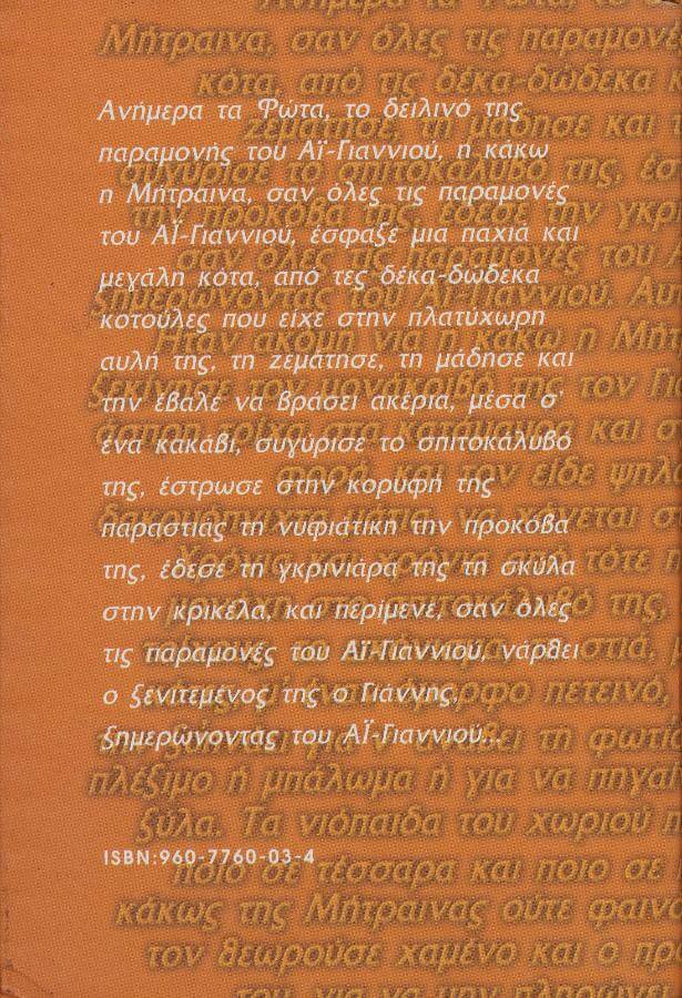 Ανήμερα τα Φώτα, το δειλινό της παραμονής του Αϊ-Γιαννιού, η κάκω η Μήτραινα, σαν όλες τις παραμονές του Αϊ-Γιαννιού, έσφαξε μια παχιά και μεγάλη κότα, από τες δέκα-δώδεκα κοτούλες που είχε στην πλατύχωρη αυλή της, τη ζεμάτησε, τη μάδησε και την έβαλε να βράσει ακέρια, μέσα σ’ ένα κακάβι, συγύρισε το σπιτοκάλυβό της, έστρωσε στην κορυφή της παραστιάς τη νυφιάτικη την προκόβα της, έδεσε τη γκρινιάρα της τη σκύλα στην κρικέλα, και περίμενε, σαν όλες τις παραμονές του Αϊ-Γιαννιού, νάρθει ο ξενιτεμένος της ο Γιάννης, ξημερώνοντας του Αϊ-Γιαννιού.