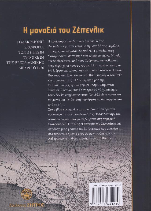 Η προϊστορία των δυτικών συνοικιών της Θεσσαλονίκης ταυτίζεται με τη μοναξιά της μεγάλης περιοχής που λεγόταν Ζέιτενλικ. Η μοναξιά αυτή διαταράσσεται στην αυγή του εικοστού αιώνα. Η πόλη απελευθερώνεται από τους Τούρκους, καταφθάνουνστην περιοχή οι πρόσφυγες του 1914, αμέσως μετά, το 1915, έρχονται τα συμμαχικά στρατεύματα του Πρώτου Παγκοσμίου Πολέμου, ακολουθεί η πυρκαγιά του 1917 και οι πυροπαθείς. Η δυτική ύπαιθρος της Θεσσαλονίκης ξαφνικά γεμίζει κόσμο. Στήνονται οικισμοί οι οποίοι, παρά τον προσωρινό χαρακτήρα τους, δε θα ερημώσουν ποτέ. Το 1922 είναι κοντά και παγιώνει μία κατάσταση που άρχισε να διαμορφώνεται από το 1914. Στο βιβλίο τεκμηριώνεται το στήσιμοτου πρώτου προσφυγικού οικισμού δυτικά της Θεσσαλονίκης, του οικισμού Λεμπέτ που μετεξελίχθηκε στη σημερινή Σταυρούπολη. Ο τίτλος <<Η μοναξιά του Ζέιτενλικ>> είναι απόδοση μιας φράσης του L. Abastado που αναφέρεται στα τελευταία χρόνια ενός εκ των ηγουμένων των Λαζαριστών στη Θεσσαλονίκη, του I.B. Boieu