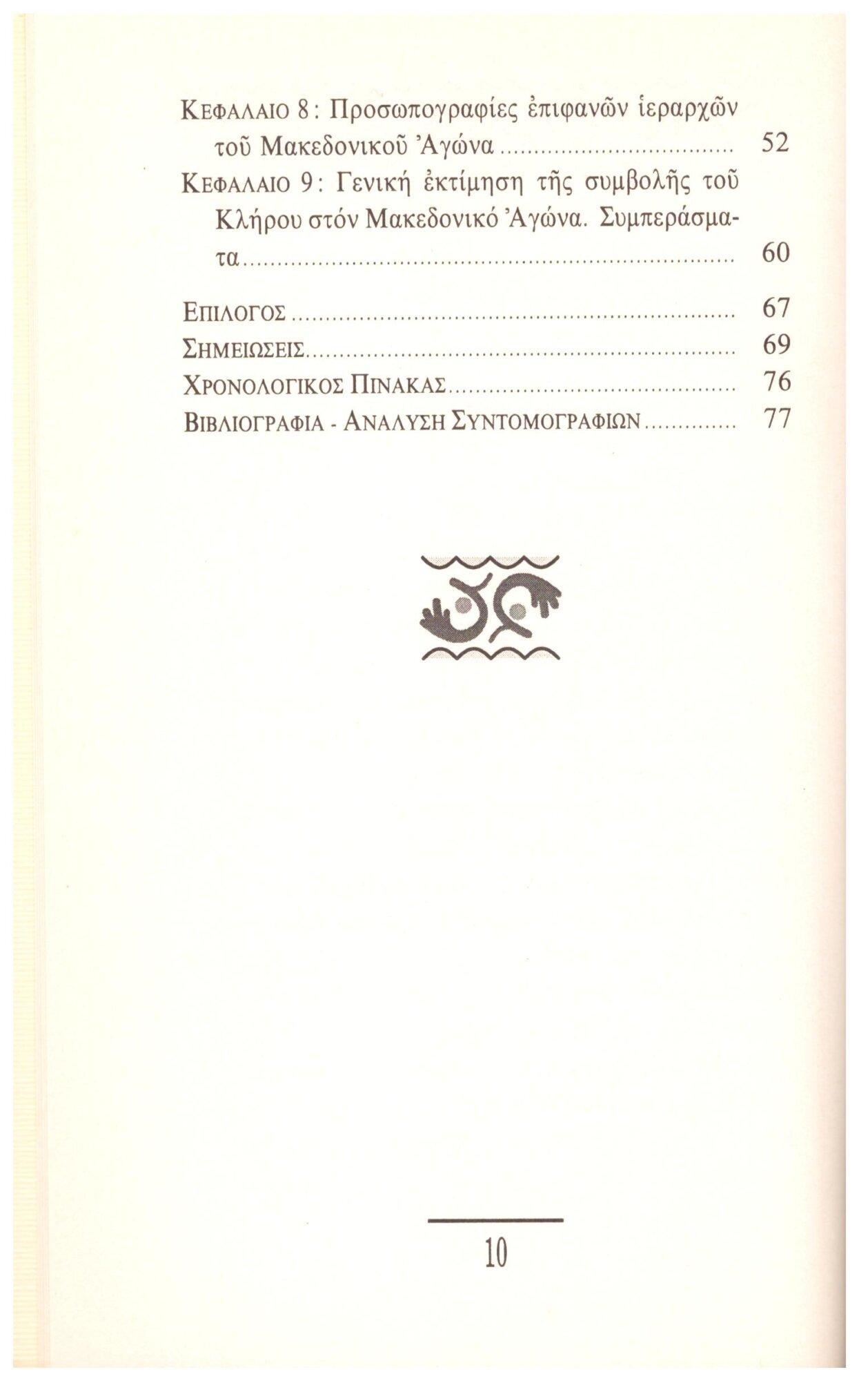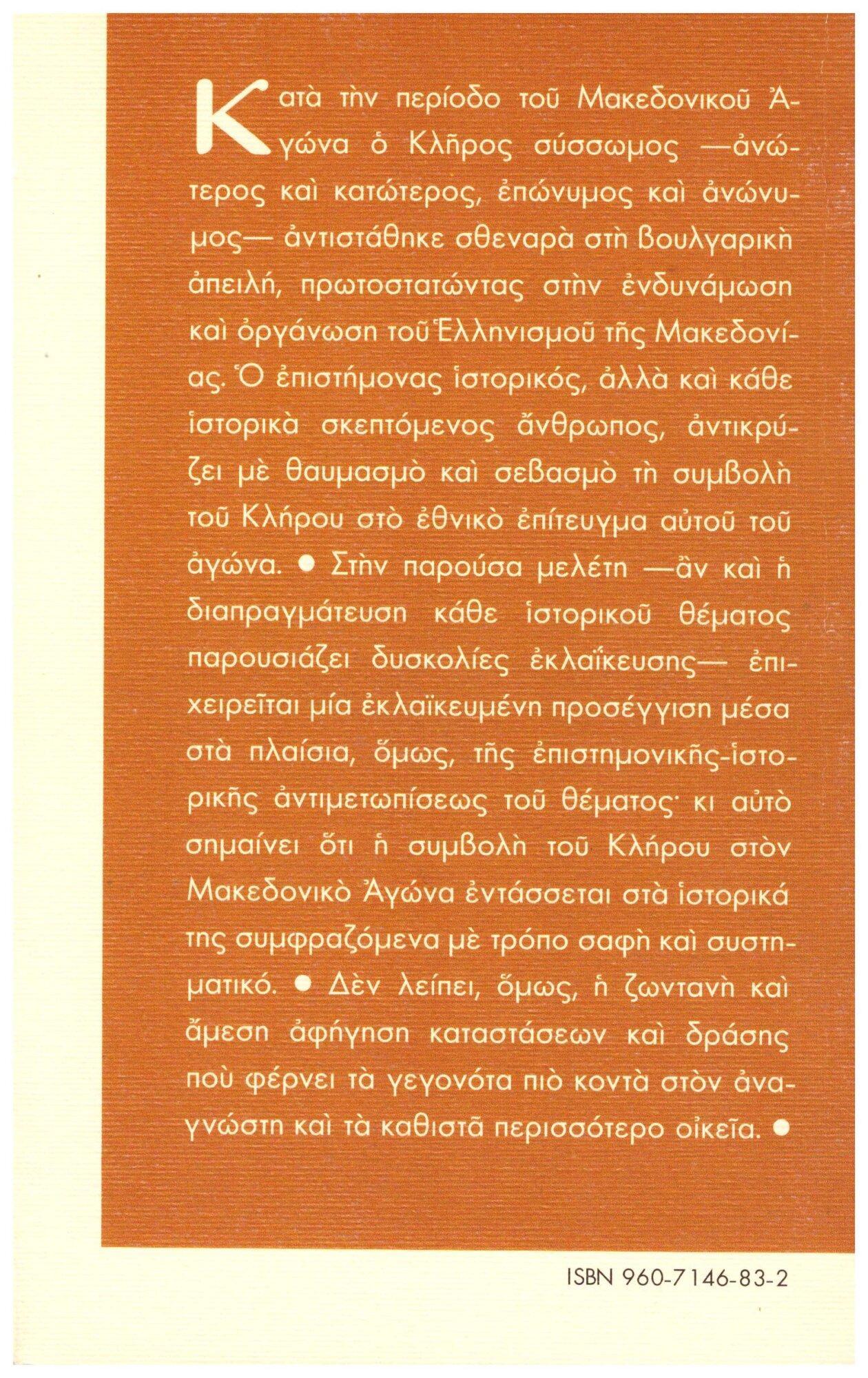 Κατά την περίοδο του Μακεδονικού Αγώνα ο Κλήρος σύσσωμος – ανώτερος και κατώτερος, επώνυμος και ανώνυμος – αντιστάθηκε σθεναρά στη βουλγαρική απειλή, πρωτοστατώντας στην ενδυνάμωση και οργάνωση του Ελληνισμού της Μακεδονίας. Ο επιστήμονας ιστορικός, αλλά και κάθε ιστορικά σκεπτόμενος άνθρωπος, αντικρίζει με θαυμασμό και σεβασμό τη συμβολή του Κλήρου στο εθνικό επίτευγμα αυτού του αγώνα. Στην παρούσα μελέτη – αν και η διαπραγμάτευση κάθε ιστορικού θέματος παρουσιάζει δυσκολίες εκλαΐκευσης – επιχειρείται μία εκλαϊκευμένη προσέγγιση μέσα στα πλαίσια, όμως, της επιστημονικής-ιστορικής αντιμετωπίσεως του θέματος κι αυτό σημαίνει ότι η συμβολή του Κλήρου στον Μακεδονικό Αγώνα εντάσσεται στα ιστορικά της συμφραζόμενα με τρόπο σαφή και συστηματικό. Δεν λείπει, όμως, η ζωντανή και άμεση αφήγηση καταστάσεων και δράσης που φέρνει τα γεγονότα πιο κοντά στον αναγνώστη και τα καθιστά περισσότερο οικεία.