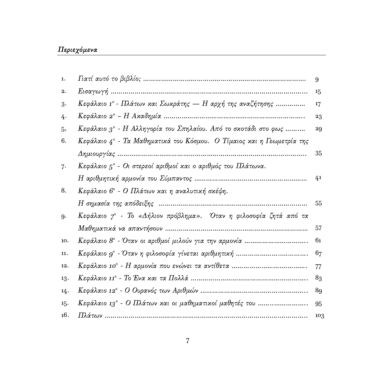 Μέσα από λόγια, εικόνες και διαλογισµούς, ο αναγνώστης βλέπει πώς η φιλοσοφία του Πλάτωνα γέννησε την επιστήµη: πώς από την παρατήρηση γεννήθηκε η απόδειξη και από τη µορφή γεννήθηκε η ιδέα.