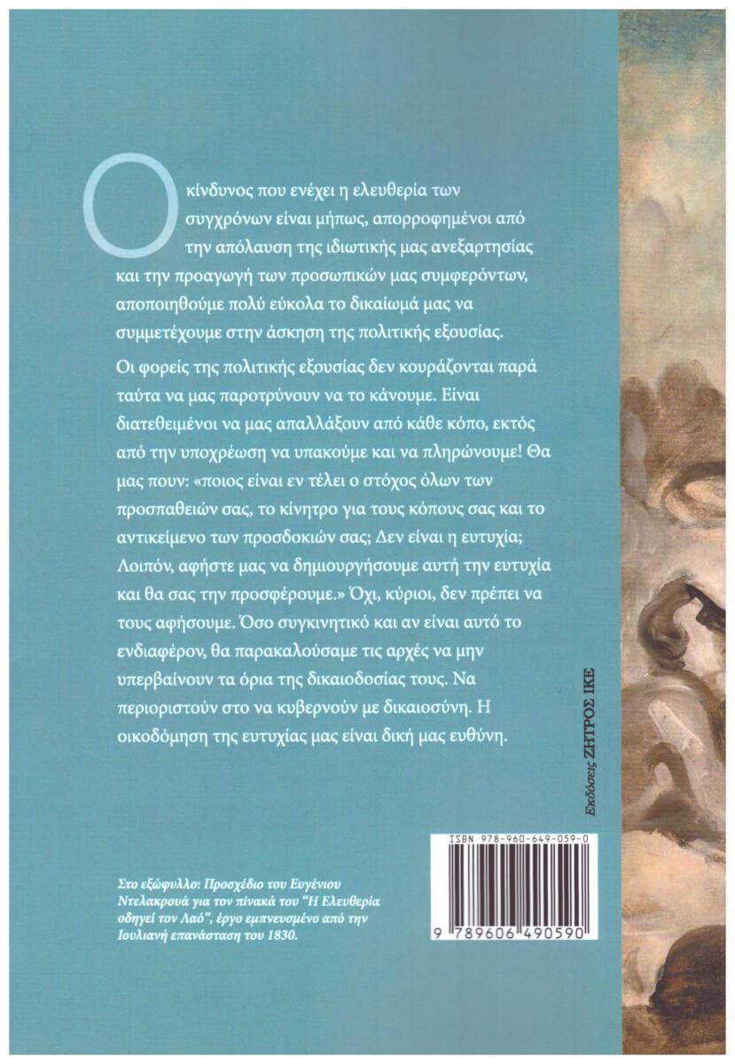 «Ο κίνδυνος που ενέχει η ελευθερία των σύγχρονων είναι μήπως, απορροφημένοι από την απόλαυση της ιδιωτικής μας ανεξαρτησίας και την προαγωγή των προσωπικών μας συμφερόντων, αποποιηθούμε πολύ εύκολα το δικαίωμά μας να συμμετέχουμε στην άσκηση της πολιτικής εξουσίας. Οι φορείς της πολιτικής εξουσίας δεν κουράζονται παρά ταύτα να μας παροτρύνουν να το κάνουμε. Είναι διατεθειμένοι να μας απαλλάξουν από κάθε κόπο, εκτός από την υποχρέωση να υπακούμε και να πληρώνουμε! Θα μας πουν: “Ποιος είναι εντέλει ο στόχος όλων των προσπαθειών σας, το κίνητρο για τους κόπους σας και το αντικείμενο των προσδοκιών σας; Δεν είναι η ευτυχία; Λοιπόν, αφήστε μας να δημιουργήσουμε αυτή την ευτυχία και θα σας την προσφέρουμε”. Όχι, κύριοι, δεν πρέπει να τους αφήσουμε. Όσο συγκινητικό και αν είναι αυτό το ενδιαφέρον, θα παρακαλούσαμε τις αρχές να μην υπερβαίνουν το όρια της δικαιοδοσίας τους. Να περιοριστούν στο να κυβερνούν με δικαιοσύνη. Η οικοδόμηση της ευτυχίας μας είναι δική μας ευθύνη».