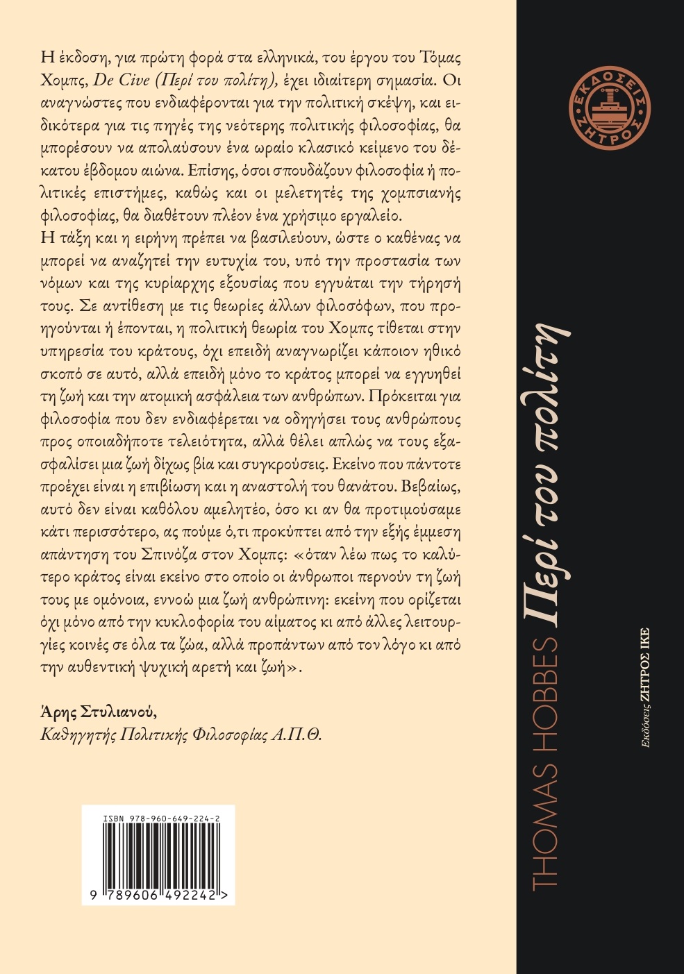 Η έκδοση, για πρώτη φορά στα ελληνικά, του έργου του Τόμας Χομπς, De Cive (Περί του πολίτη), έχει ιδιαίτερη σημασία. Οι αναγνώστες που ενδιαφέρονται για την πολιτική σκέψη, και ειδικότερα για τις πηγές της νεότερης πολιτικής φιλοσοφίας, θα μπορέσουν να απολαύσουν ένα ωραίο κλασικό κείμενο του δέκατου έβδομου αιώνα. Επίσης, όσοι σπουδάζουν φιλοσοφία ή πολιτικές επιστήμες, καθώς και οι μελετητές της χομπσιανής φιλοσοφίας, θα διαθέτουν πλέον ένα χρήσιμο εργαλείο. Η τάξη και η ειρήνη πρέπει να βασιλεύουν, ώστε ο καθένας να μπορεί να αναζητεί την ευτυχία του, υπό την προστασία των νόμων και της κυρίαρχης εξουσίας που εγγυάται την τήρησή τους. Σε αντίθεση με τις θεωρίες άλλων φιλοσόφων, που προηγούνται ή έπονται, η πολιτική θεωρία του Χομπς τίθεται στην υπηρεσία του κράτους, όχι επειδή αναγνωρίζει κάποιον ηθικό σκοπό σε αυτό, αλλά επειδή μόνο το κράτος μπορεί να εγγυηθεί τη ζωή και την ατομική ασφάλεια των ανθρώπων.