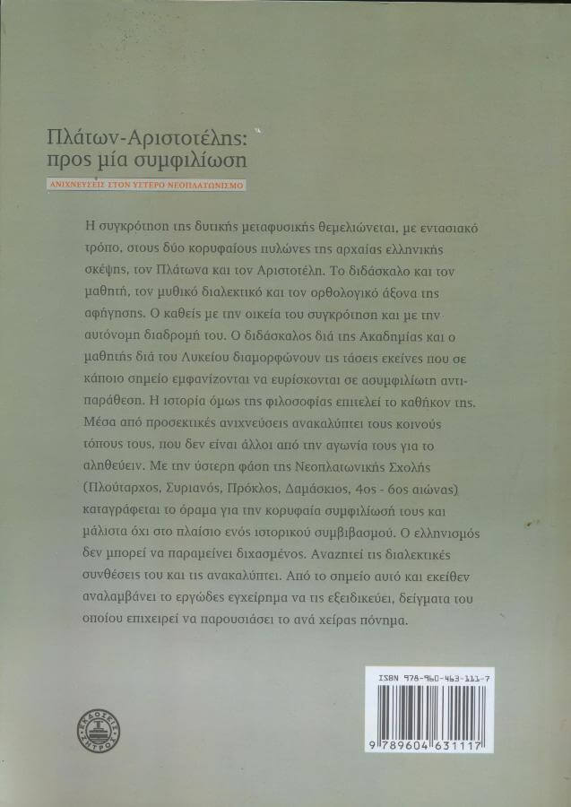 Η συγκρότηση της δυτικής μεταφυσικής θεμελιώνεται, με εντασιακό τρόπο, στους δυο κορυφαίους πυλώνες της αρχαίας ελληνικής σκέψης, τον Πλάτωνα και τον Αριστοτέλη. Το διδάσκαλο και τον μαθητή, τον μυθικό διαλεκτικό και τον ορθολογικό άξονα της αφήγησης. Ο καθείς με την οικεία του συγκρότηση και με την αυτόνομη διαδρομή του. Ο διδάσκαλος δια της Ακαδημίας και ο μαθητής δια του Λυκείου διαμορφώνουν τις τάσεις εκείνες που σε κάποιο σημείο εμφανίζονται να ευρίσκονται σε ασυμφιλίωτη αντιπαράθεση. Η ιστορία όμως της φιλοσοφίας επιτελεί το καθήκον της. Μέσα από προσεκτικές ανιχνεύσεις ανακαλύπτει τους κοινούς τόπους τους, που δεν είναι άλλοι από την αγωνία τους για το αληθεύειν. Με την ύστερη φάση της Νεοπλατωνικής Σχολής (Πλούταρχος, Συριανός, Πρόκλος, Δαμάσκιος, 4ος – 6ος αιώνας) καταγράφεται το όραμα για την κορυφαία συμφιλίωσή τους και μάλιστα όχι στο πλαίσιο ενός ιστορικού συμβιβασμού. Ο ελληνισμός δεν μπορεί να παραμείνει διχασμένος. Αναζητεί τις διαλεκτικές συνθέσεις του και τις ανακαλύπτει. Από το σημείο αυτό και εκείθεν αναλαμβάνει το εργώδες εγχείρημα να τις εξειδικεύει, δείγματα του οποίου επιχειρεί να παρουσιάσει το ανά χείρας πόνημα. (ΑΠΟ ΤΗΝ ΠΑΡΟΥΣΙΑΣΗ ΣΤΟ ΟΠΙΣΘΟΦΥΛΛΟ ΤΟΥ ΒΙΒΛΙΟΥ)