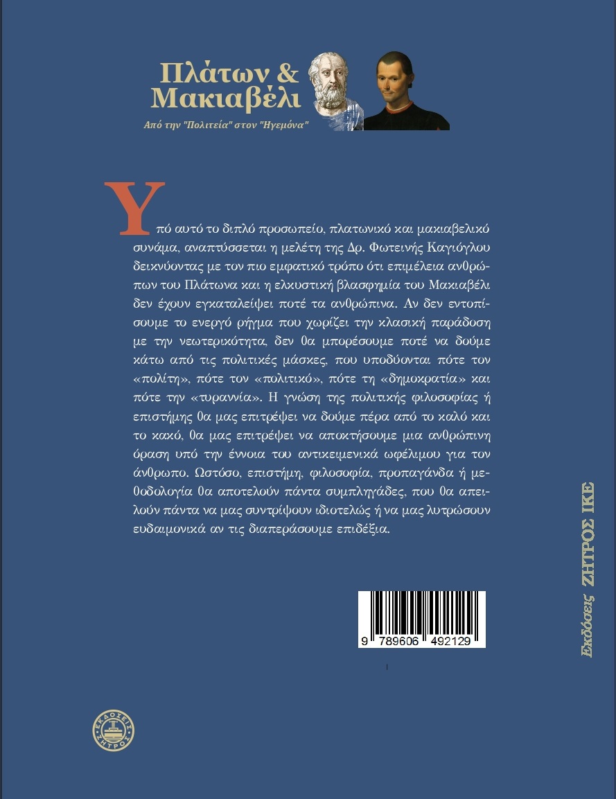 Υπό αυτό το διπλό προσωπείο, πλατωνικό και μακιαβελικό συνάμα, αναπτύσσεται η μελέτη της Δρ. Φωτεινής Καγιόγλου δεικνύοντας με τον πιο εμφατικό τρόπο ότι επιμέλεια ανθρώπων του Πλάτωνα και η ελκυστική βλασφημία του Μακιαβέλι δεν έχουν εγκαταλείψει ποτέ τα ανθρώπινα. Αν δεν εντοπίσουμε το ενεργό ρήγμα που χωρίζει την κλασική παράδοση με την νεωτερικότητα, δεν θα μπορέσουμε ποτέ να δούμε κάτω από τις πολιτικές μάσκες, που υποδύονται πότε τον «πολίτη», πότε τον «πολιτικό», πότε τη «δημοκρατία» και πότε την «τυραννία». Η γνώση της πολιτικής φιλοσοφίας ή επιστήμης θα μας επιτρέψει να δούμε πέρα από το καλό και το κακό, θα μας επιτρέψει να αποκτήσουμε μια ανθρώπινη όραση υπό την έννοια του αντικειμενικά ωφέλιμου για τον άνθρωπο. Ωστόσο, επιστήμη, φιλοσοφία, προπαγάνδα ή μεθοδολογία θα αποτελούν πάντα συμπληγάδες, που θα απειλούν πάντα να μας συντρίψουν ιδιοτελώς ή να μας λυτρώσουν ευδαιμονικά αν τις διαπεράσουμε επιδέξια.