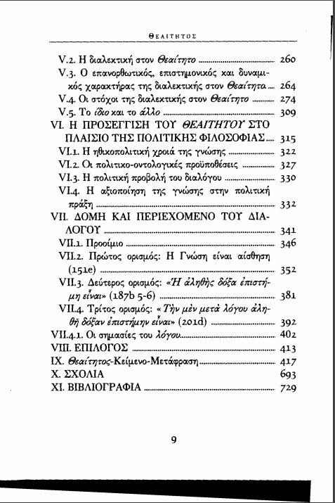 Κύριο αντικείμενο έρευνας του διαλόγου του Πλάτωνος Θεαίτητος είναι η αναζήτηση ενός καθολικά αποδεκτού ορισμού της γνώσης και ειδικότερα η σχέση της γνώσης προς την αλήθεια. Παράλληλα όμως αναπτύσσεται και λόγος για τη σχέση της αγνωσίας προς την πλάνη, στο πλαίσιο της σύγκρισης της προσωπικότητας του φιλοσόφου προς το “προσωπείο” του σοφιστή. Η γνώση που διασφαλίζει την αλήθεια και απομακρύνει την πλάνη, η οποία δεν είναι μόνο άχρηστη αλλά και επικίνδυνη, επιτυγχάνεται μέσω της ανάκλησης των ιδεών στον πλατωνικό λόγο. Εν τοιαύτη περιπτώσει, ο Θεαίτητος προσφέρεται ως το κατ’ εξοχήν πεδίο να προβάλει ο Πλάτων την ισχύ της θεωρίας του για τις ιδέες. Ωστόσο, η ανάδειξη της άρρηκτης σχέσης της γνωσιολογίας και οντολογίας του φιλοσόφου, μέσω της θεωρίας των ιδεών, δεν θα παρουσιαστεί με τον κλασικό τρόπο στον Θεαίτητο, όπως ακριβώς εμφανίζεται σε προγενέστερους και μεταγενέστερους διάλογους. Αυτή είναι μια από τις ιδιαιτερότητες του διαλόγου και βασικό θέμα όλων των φιλοσοφικών συζητήσεων και μελετών σχετικά με τον Θεαίτητο. […] (Από τον πρόλογο της έκδοσης)