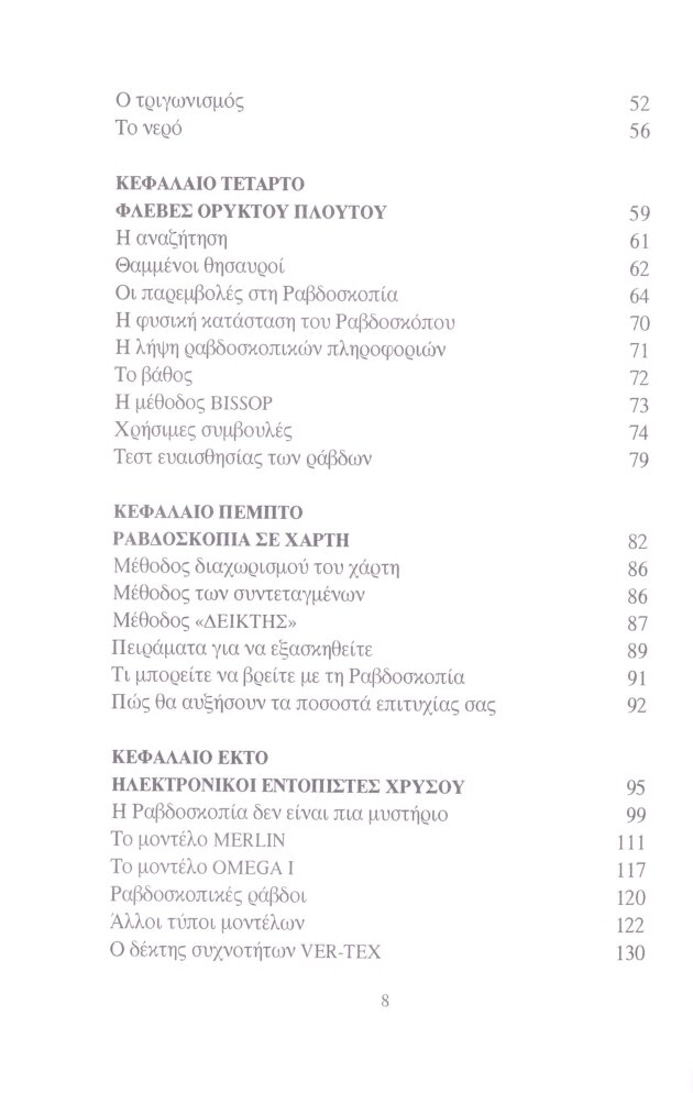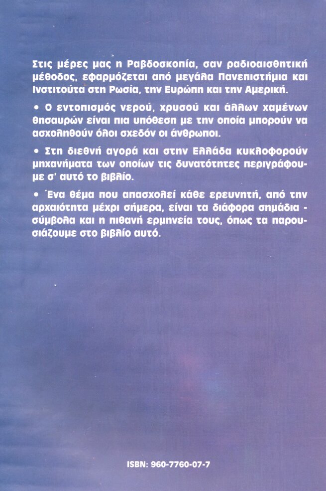 Στις μέρες μας η Ραβδοσκοπία, σαν ραδιοαισθητική μέθοδος, εφαρμόζεται από μεγάλα Πανεπιστήμια και Ινστιτούτα στη Ρωσία, την Ευρώπη και την Αμερική. Ο εντοπισμός νερού, χρυσού και άλλων χαμένων θησαυρών είναι πια υπόθεση με την οποία μπορούν να ασχοληθούν όλοι σχεδόν οι άνθρωποι. Στη διεθνή αγορά και στην Ελλάδα κυκλοφορούν μηχανήματα των οποίων τις δυνατότητες περιγράφουμε σ’ αυτό το βιβλίο. Ένα θέμα που απασχολεί κάθε ερευνητή, από την αρχαιότητα μέχρι σήμερα, είναι τα διάφορα σημάδια – σύμβολα και η πιθανή ερμηνεία τους, όπως τα παρουσιάζουμε στο βιβλίο αυτό.