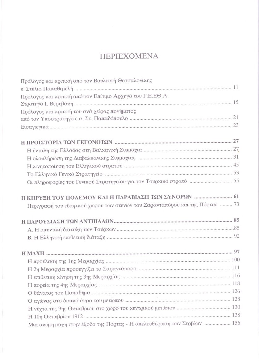 Έτσι φτάσαμε στον άρτια εξοπλισμένο Ελληνικό στρατό του ’12, πράγμα που έδινε τη δυνατότητα στον πρωθυπουργό Βενιζέλο να χειριστεί με τόλμη και ρεαλισμό το ζήτημα της ένταξης της Ελλάδας στην υπό διαμόρφωση τότε διαβαλκανική συμμαχία. Παρ’ όλα αυτά, όταν στις 8 Οκτωβρίου 1912 κηρύχτηκε ο Α’ Βαλκανικός Πόλεμος, λίγοι ευελπιστούσαν πως ο Ελληνικός στρατός θα ήταν σε θέση να παραβιάσει την Ελληνοτουρκική μεθοριακή γραμμή. Και όμως, ο στρατός μας τότε έκανε πράξη το θεωρούμενο από πολλούς ακατόρθωτο. Έτσι, σε τέσσερις μέρες μετά την κήρυξη του πολέμου, κατήγαγε την πρώτη μας νίκη στη στενωπό του Σαρανταπόρου. Πρόκειται για τη νίκη που εκτυλίσσεται ανάγλυφη μέσα από την ιστορική αφήγηση την οποία επιχειρεί το παρόν βιβλίο.