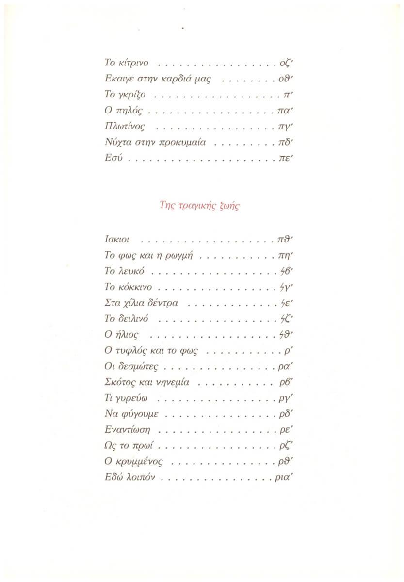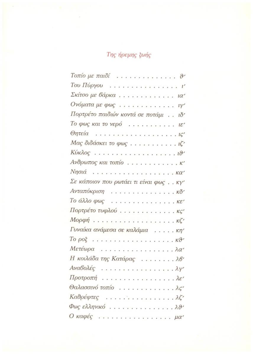 Τα περισσότερα ποιήματα είναι ολιγόστιχα, θα έλεγα επιγραμματικά και αυτό είναι ένα μεγάλο προσόν. Το έργο είναι χωρισμένο σε τρεις ενότητες. Η πρώτη με τίτλο Tης αισθαντικής ζωής, περιέχει 33 ποιήματα.