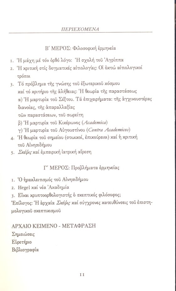 Ο Πύρρων έζησε ένα συνταρακτικό γεγονός: την εκστρατεία του Μ. Αλεξάνδρου. Τον συνόδευσε και έφτασε ώς την Ινδία. Και εκεί γνώρισε τους ινδούς σοφούς: τους γυμνοσοφιστές. Είδε ξένους λαούς με ξένους, περίεργους, ίσως, τρόπους ζωής και σκέψης. Και τότε με δύναμη πρόβαλε στο νου του η σχετικότητα των πραγμάτων. Θρησκευτικές λατρείες, μυθολογικές προλήψεις, ήθη κι έθιμα, νόμοι, διαφέρουν από λαό σε λαό. Δεν μπορούμε να έχουμε βέβαιη γνώση για τίποτε. Δεν ωφελεί να βασανίζουμε τον νου, βασανισμός που φέρνει στην ψυχή ταραχή· αυτά αρχίζει να διδάσκει ο Πύρρων σαν επέστρεψε από την Ινδία πίσω στην Πελοπόννησο, φορτωμένος την πλούσια εμπειρία της μακρινής πορείας. Έτσι γεννήθηκε ο πυρρωνισμός, η πιο αυθεντική έκφραση του αρχαίου σκεπτικισμού. Έτσι όμως γεννήθηκε και ο διάλογος, ο πιο μακρύς στην ιστορία της φιλοσοφίας, ο διάλογος των σκεπτικών με όσους πίστευαν στη βεβαιότητα της γνώσης, στην αλήθεια, ο διάλογος με τους δογματικούς (…) Στον ορίζοντα αυτής της στάσης διαφαίνεται η διαρκής ελπίδα να κατανοήσει ο άνθρωπος την ουσία των πραγμάτων, εκεί ζει ο ίμερος της αλήθειας. Είναι το τραγικό στίγμα του αυθεντικού φιλόσοφου, η μοίρα του. Την αποδέχεται ο σκεπτικός και, τη στιγμή που την αποδέχεται, την ίδια στιγμή η στάση αυτή τον καταξιώνει. Υψώνεται στη φιλοσοφία. Η αδυναμία γίνεται δύναμη και ο σκεπτικός, ο φιλόσοφος πια, βιώνει την αλήθεια του αφιλόσοφου λόγου, την αλήθεια της αταραξίας· αυτό είναι το μάθημα του πυρρωνισμού που μας δίνουν οι «Πυρρώνειες Υποτυπώσεις», η συνοπτική δηλαδή παρουσίαση των αρχών της αρχαίας σκέψης που έχει την καταγωγή της στον Πύρρωνα. Συγγραφέας είναι ένας εμπειρικός γιατρός, ο Σέξτος, που ζει αιώνες αργότερα. (Απόσπασμα από τον πρόλογο της έκδοσης)