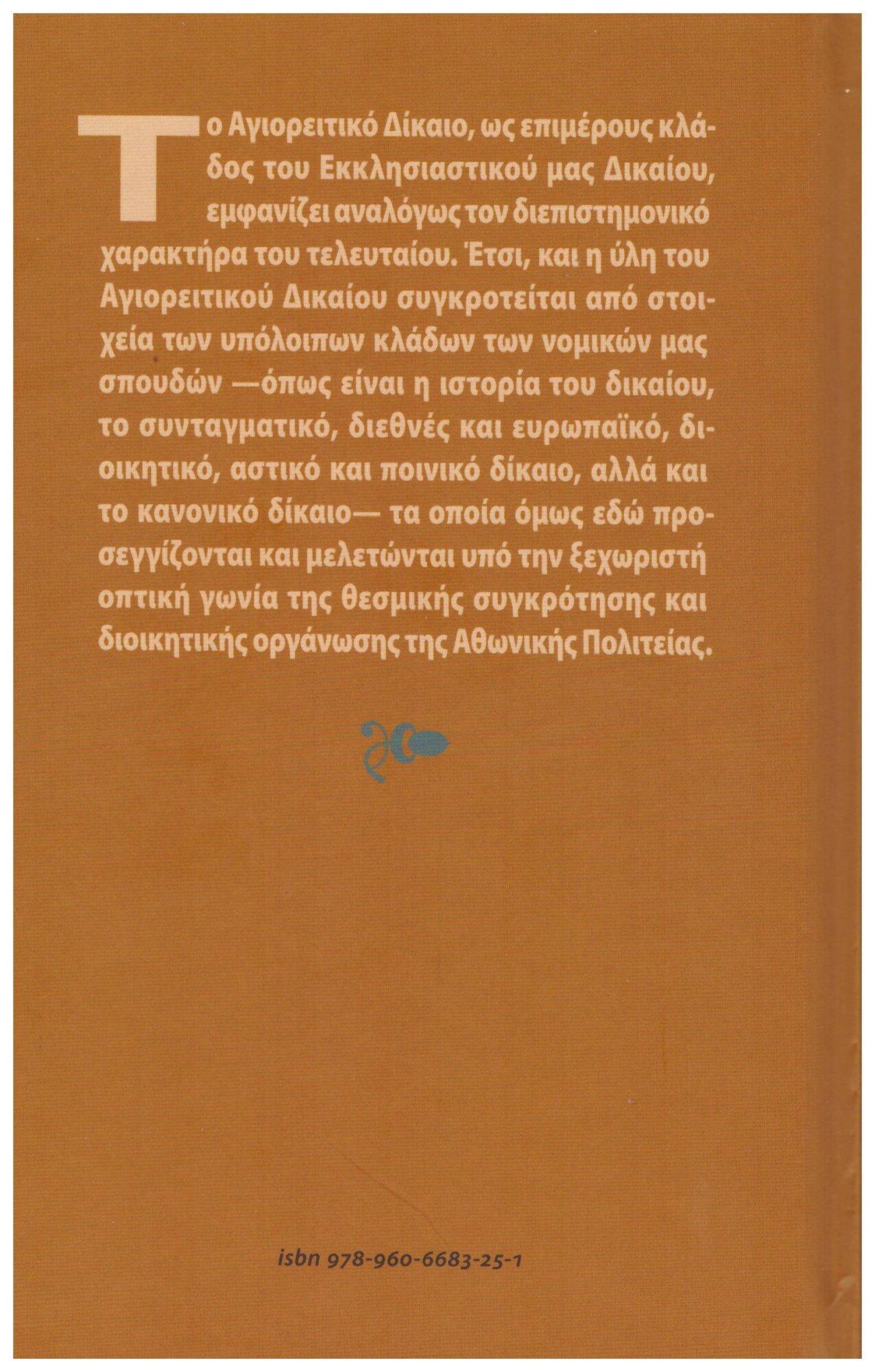 Το Αγιορειτικό Δίκαιο, ως επιμέρους κλάδος του Εκκλησιαστικού μας Δικαίου, εμφανίζει αναλόγως τον διεπιστημονικό χαρακτήρα του τελευταίου. Έτσι, και η ύλη του Αγιορειτικού Δικαίου συγκροτείται από στοιχεία των υπόλοιπων κλάδων των νομικών μας σπουδών -όπως είναι η ιστορία του δικαίου, το συνταγματικό, διεθνές και ευρωπαϊκό, διοικητικό, αστικό και ποινικό δίκαιο, αλλά και το κανονικό