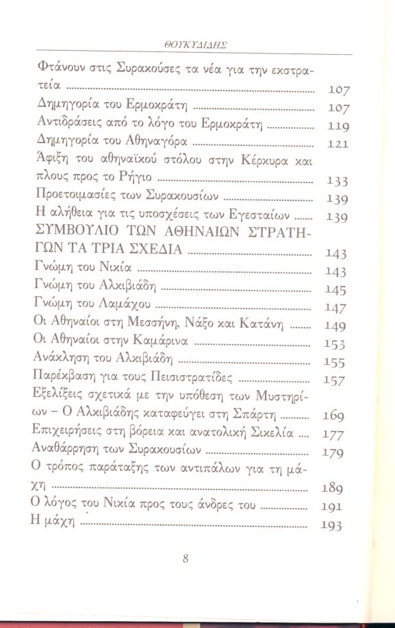 Το 6ο και το 7ο βιβλίο του Θουκυδίδη αποτελούν τα λεγόμενα “Σικελικά” και αναφέρονται στην εκστρατεία των Αθηναίων στη Σικελία (415-413 π.Χ.). Είναι τα πιο καλοδουλεμένα τμήματα των Ιστοριών του Θουκυδίδη συγκεκριμένα, η περιγραφή της αναχώρησης του στόλου από τον Πειραιά (Ζ. 30-32), της ναυμαχίας στο μεγάλο λιμάνι των Συρακουσών (Η. 70-72) και κυρίως της σφαγής των Αθηναίων στον Ασσίναρο ποταμό (Η. 84) θεωρούνται μέχρι και σήμερα μερικά από τα καλύτερα κομμάτια της παγκόσμιας λογοτεχνίας, πράγμα που δείχνει ότι ο ιστορικός δεν περιγράφει απλώς με τρόπο ωμό και ρεαλιστικό τα γεγονότα αλλά είναι και ένας μεγάλος δεξιοτέχνης του λόγου. Έτσι, ο TH. MACAULEY, ιστορικός και πολιτικός δεν διστάζει να πει: “είναι το μεγαλύτερο επίτευγμα της ανθρώπινης τέχνης”, ενώ ο ιστορικός και φιλόσοφος J. MILL αναγνωρίζει ότι η περιγραφή της συμφοράς των Αθηναίων στον Ασσίναρο είναι το “πιο δυνατό και συγκινητικό κομμάτι της λογοτεχνίας”. […] (Από την εισαγωγή της έκδοσης)