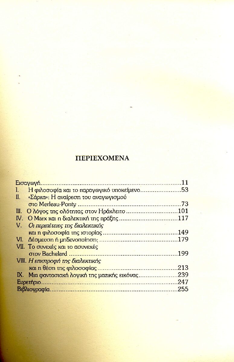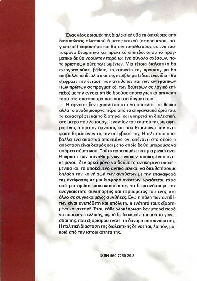 «Ένας νέος ορισμός της διαλεκτικής θα τη διαχώριζε από διατυπώσεις ολιστικού ή μεταφυσικού (αφηρημένου, παγιωτικού) χαρακτήρα και θα την τοποθετούσε σε ένα ταυτόχρονα θεωρητικό και πρακτικό επίπεδο, όπου το πραγματικό δεν θα νοούνταν παρά ως ένα σύνολο σχέσεων, ποτέ οριστικών ούτε τελειωμένων. Μια τέτοια διαλεκτική θα ενεργοποιούσε, βέβαια, το στοιχείο της άρνησης, μα θα απέβαλε το ιδεαλιστικό της περίβλημα (ιδέα, ένα, ίδιο). Θα εξέφραζε την ένταση των αντίθετων και των αντιφατικών (των πρώτων σε πραγματικό, των δεύτερων σε λογικό επίπεδο) με την έννοια ότι θα δρούσε αποπαγιωτικά απέναντι τόσο στο σκεπτικισμό όσο και στο δογματισμό… Η άρνηση δεν εξαντλείται στο να αποκλείει το θετικό, αλλά το αναδημιουργεί πέρα από τα επιφανειακά όριά του, το καταστρέφει και το διατηρεί, και υπηρετεί τη διαλεκτική, στο μέτρο που λειτουργεί εναντίον του εαυτού της ως αφηρημένης ή άμεσης άρνησης και που θεμελιώνει την αντίφαση θεμελιώνοντας την υπέρβασή της. Η τελευταία υποβάλλει ένα αποστασιοποιημένο ον, απέναντι στο οποίο η απόσταση είναι δεσμός και με το οποίο δεν θα μπορούσε να υπάρχει σύμπτωση. Τούτο προετοιμάζει και μια ριζική αναθεώρηση των συνηθισμένων εννοιών υποκειμένου – αντικειμένου: δεν αρκεί μόνο να δούμε το αντικείμενο υποκειμενικά και το υποκείμενο αντικειμενικά, να διευθετήσουμε δηλαδή την κοινή ζωή των αντιθέτων με την επαναφορά της αντίφασης σε μια διαφορά σχέσεων. Χρειάζεται, πέρα από μια πρώτη ”σχετικοποίηση”, να διερευνήσουμε την αναγκαιότητα συνύπαρξης και περάσματος του ενός στο άλλο σε συγκεκριμένες συνθήκες. Ενώ η πάλη των αντιθέτων είναι ανυπόθετη και απόλυτη, η ενότητά τους εξαρτημένη και σχετική. Έτσι, κάθε ολοκλήρωση δεν μπορεί παρά να παραμένει ελλιπής, αφού δεν διαχωρίζεται από το γίγνεσθαί της, που εξ ορισμού ενέχει τη δύναμη αυτοαναίρεσης. Η πολιτική διάσταση της διαλεκτικής δε νοείται, λοιπόν, μακριά από την ιστορικότητά της».